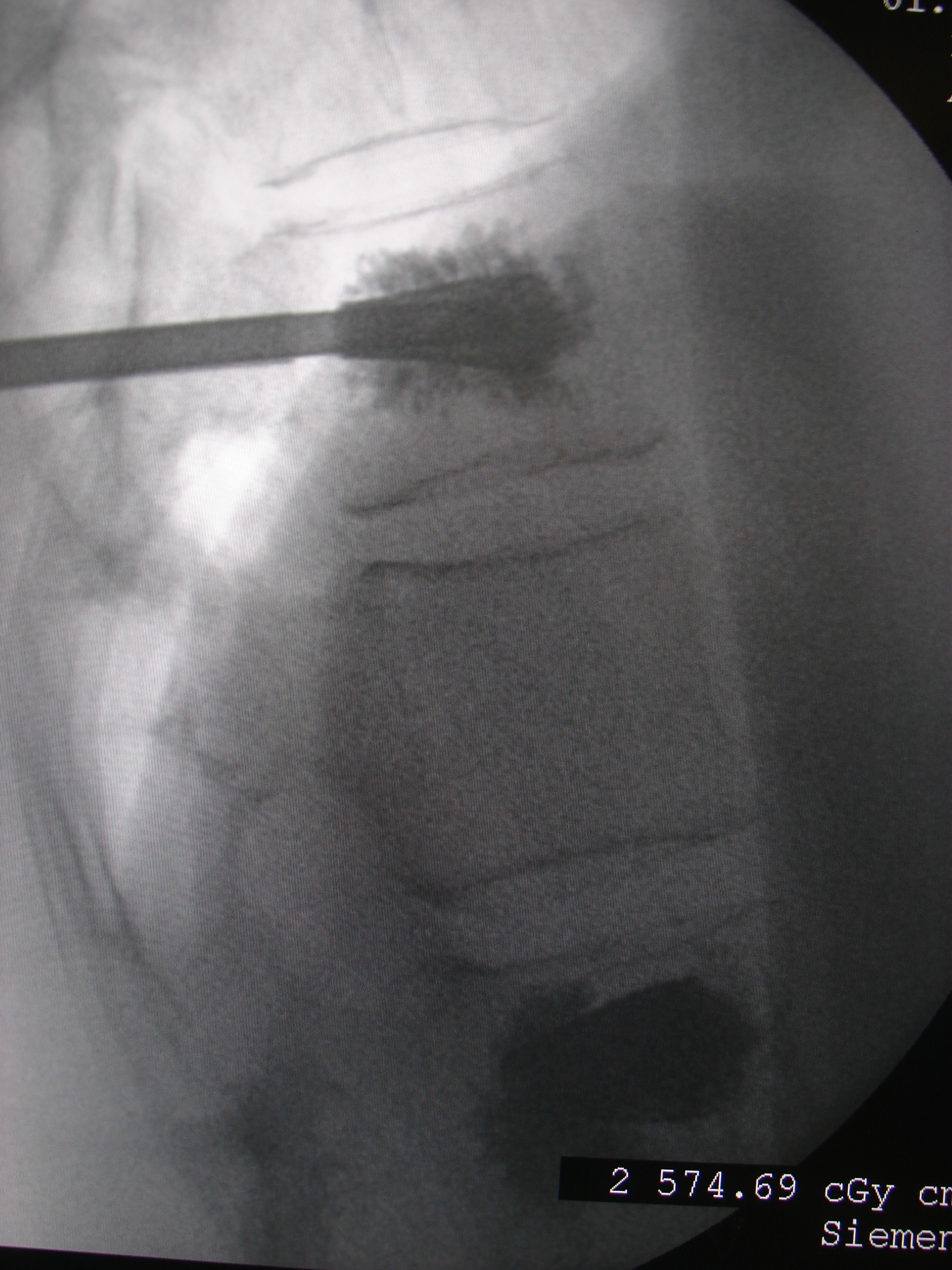 Δια την αντιμετώπιση των επωδύνων σπονδυλικών μεταστάσεων, πραγματοποιήθηκε ενίσχυση των σπονδυλικών σωμάτων με Methylmethacrylate (P.M.M.P.).